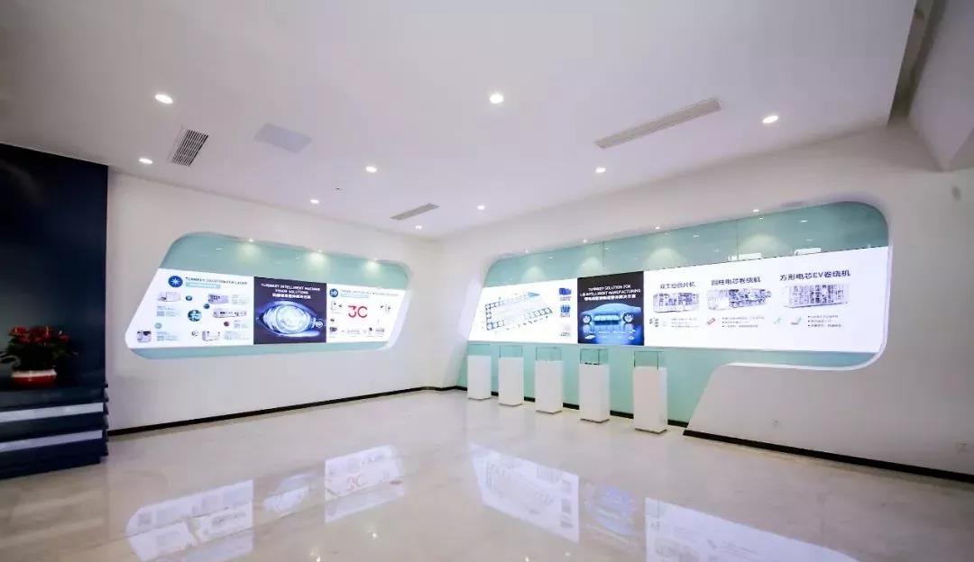 數(shù)字化的智慧展廳的建設對企業(yè)尤為重要,是對外展示企業(yè)形象的重要窗口,是企業(yè)自身的形象名片。先導智能展廳大樓整體及內部設計無不體現(xiàn)大企風貌,結合LOGO的元素為主色調,凸顯展廳風格和企業(yè)文化。進門大廳的梯形屏與造型相互映襯,融為一體,甚是美觀。